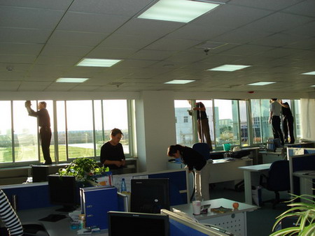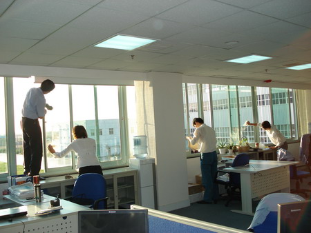 業(yè)務(wù)技術(shù)黨支部共32人參加勞動,支部書記梁文運與支委們首先對負(fù)責(zé)清理的二樓、四樓場所及會議室的窗戶和地面進(jìn)行了詳細(xì)分工,使大家在有限的時間內(nèi)有條不紊的進(jìn)行。特別是二樓只有13人參加勞動,衛(wèi)生清理工作量比較大,但大家都沒有任何怨言。在勞動中,鄭素紅、房凝、徐寶紅、牛愛香四位女同志連續(xù)工作一個半小時打掃了二樓的所有辦公室和會議室的地面。李正民副總和李同華副總率先帶頭擦起了窗戶,在擦完窗戶后大家又把所有的窗臺和地面的衛(wèi)生死角清理了一遍。
