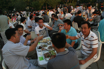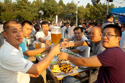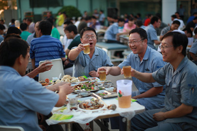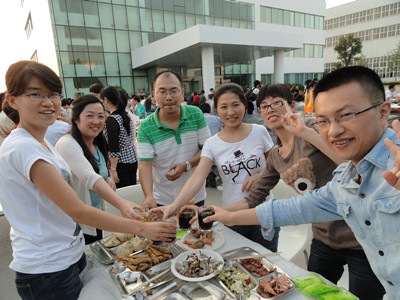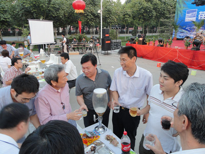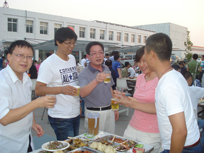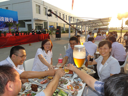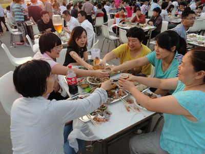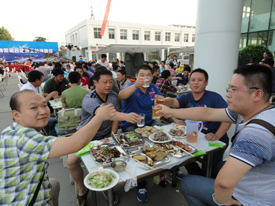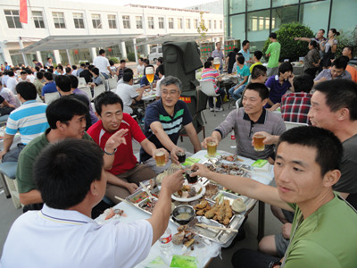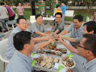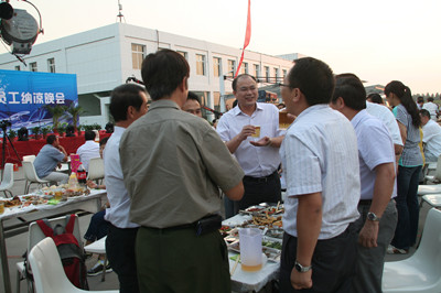 17:30分, “第四屆員工納涼晚會”正式開始。首先是員工聚餐。近400名員工,伴著歡快的樂曲聲,推杯換盞,大快朵頤。公司總經(jīng)理志賀進(jìn)、常務(wù)副總經(jīng)理王正軍等公司領(lǐng)導(dǎo)走入員工中,與員工們親切交談,敬酒祝愿,整個會場洋溢著一張張歡樂的笑臉。
